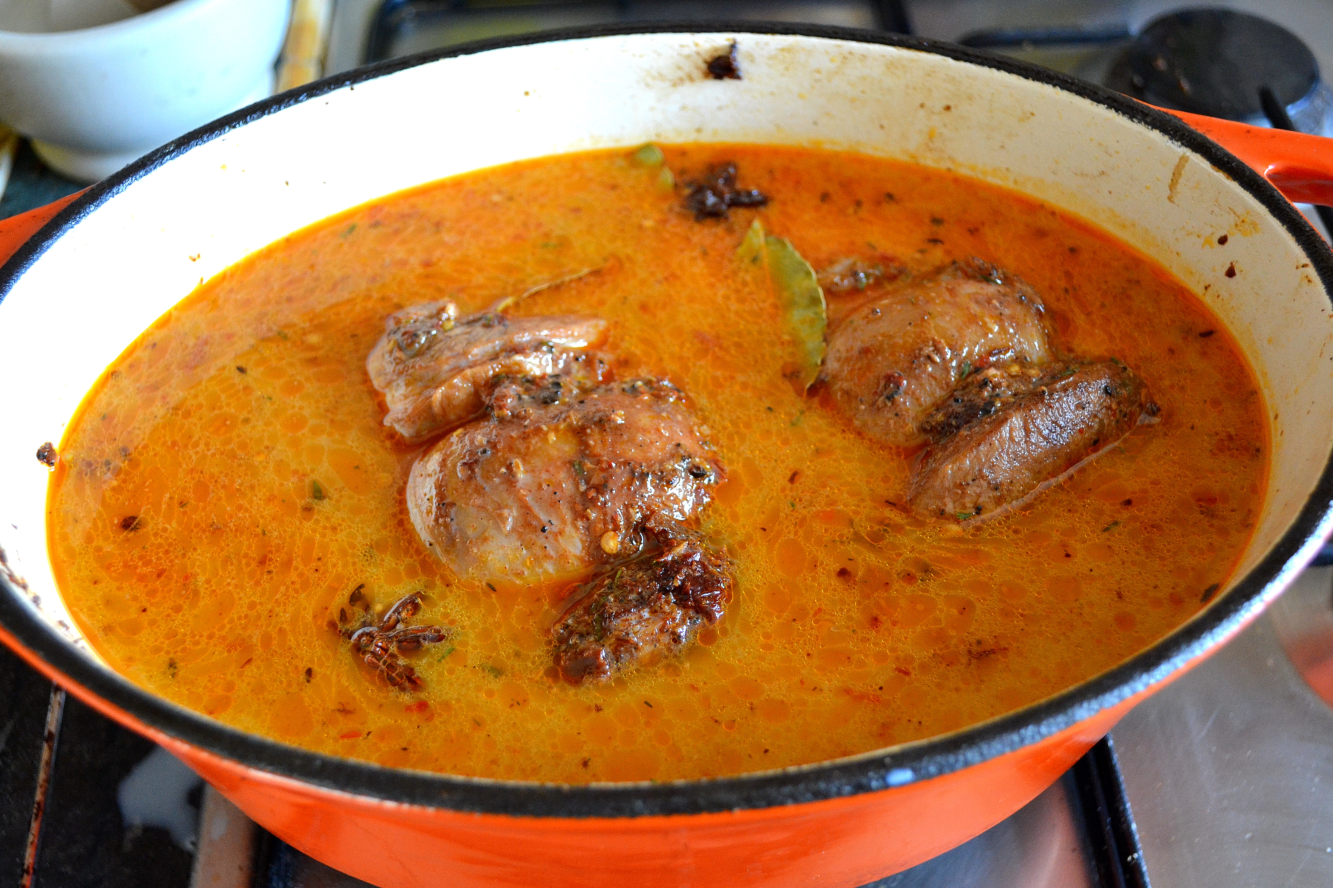 Heat the vegetable oil in your casserole pot and lightly brown the meat on all sides. Pour in a little stock, scrape up any of the spice paste that has adhered to the pan, and then return the meat to the pot, and add the remaining stock, milk, bay leaves, two tablespoons of honey, and star anise, if using, and any leftover spice paste.
