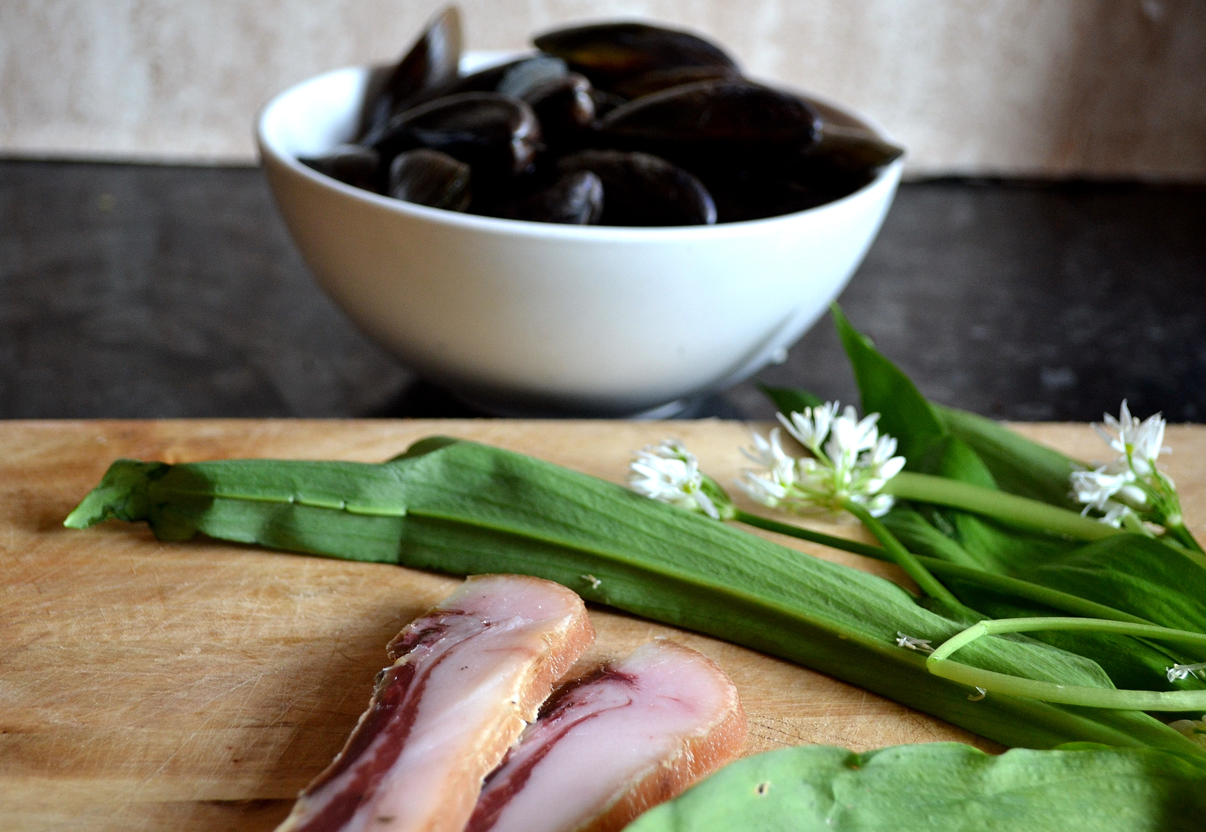 Oh, wonderful! First of all, I love your photos. I’ve never seen a striped mussel shell like that. And, we’ve been looking for something to use Steve’s remaining guanciale in. It’s been languishing in the freezer. Guanciale is absolutely delicious, as you say, but one can only do so much carbonara. Our ramps are gone, but the green garlic is here, so I think that will make a fine substitute.