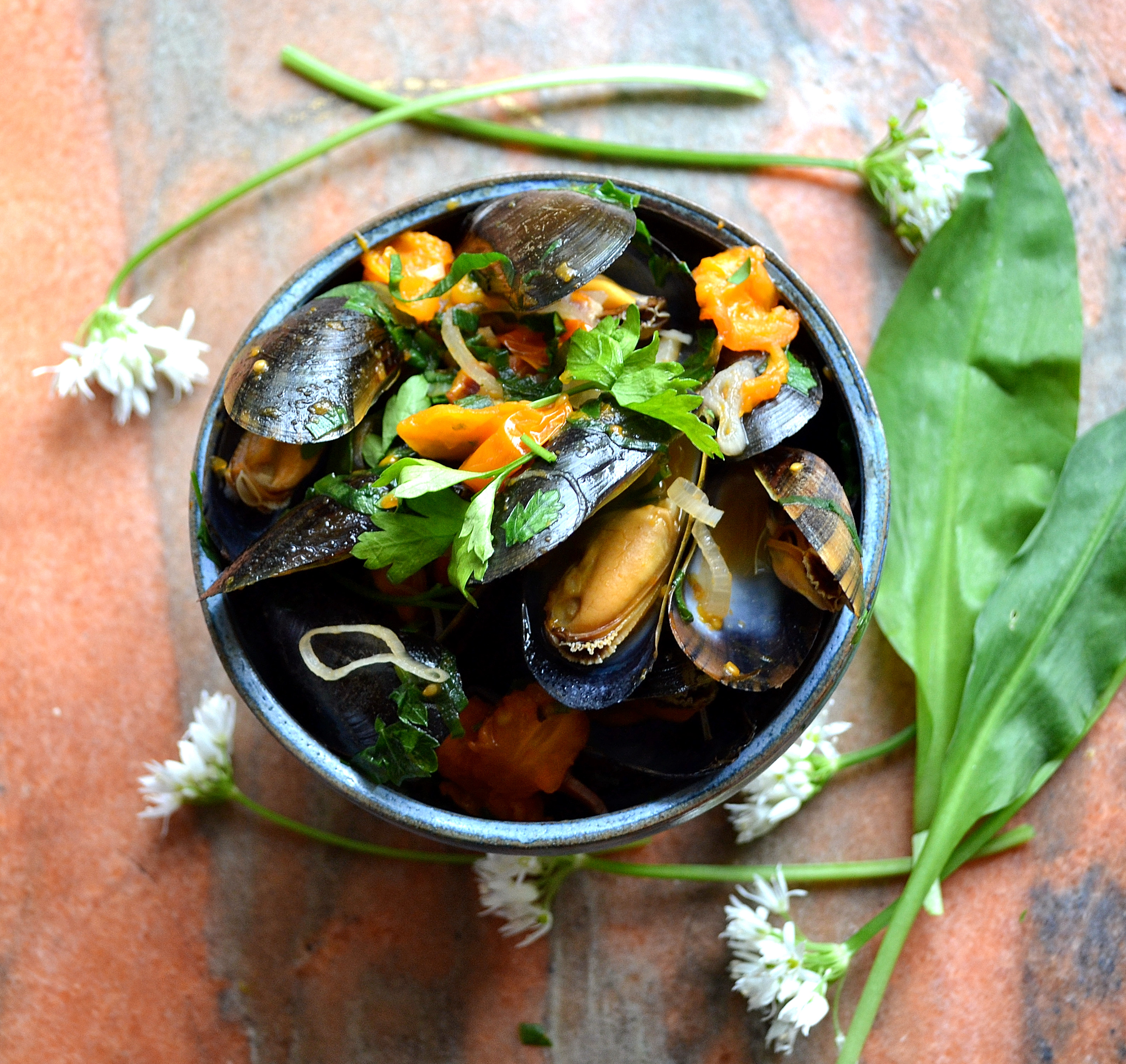 As for the wild garlic, I think this may be one of my favorite uses so far. It is so wonderfully fragrant, and with the sweet grape tomatoes, briny liquid from the mussels, and fatty pig cheek, it is heaven. Serve these mussels with plenty of crusty bread to mop up the delicious juices, or you can even toss them with linguine.