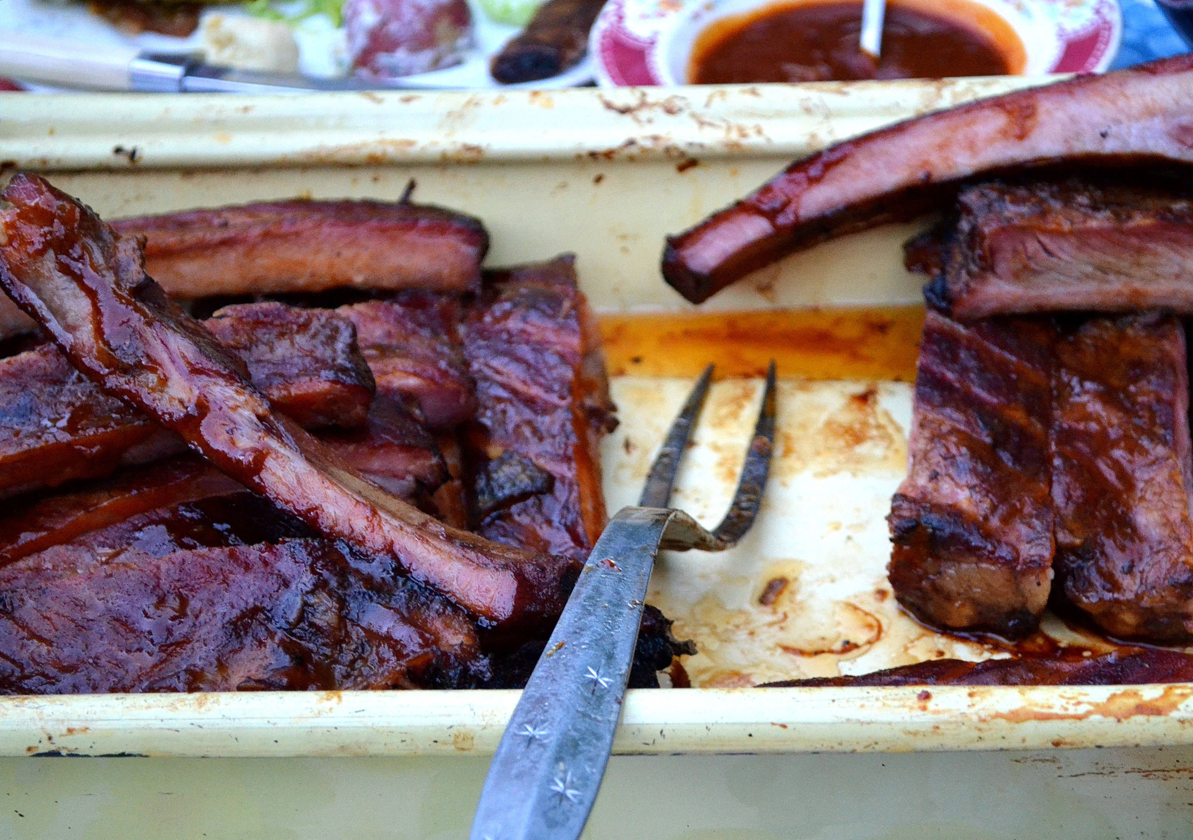 You may want to know that the recipe also works in an oven. Both of us know that ribs done in a smoker gain an irresistible flavor dimension; however, the oven produced absolutely credible results. I did add a slight change: as a last step, after painting the ribs with sauce, I put them under a hot broiler for about three minutes.