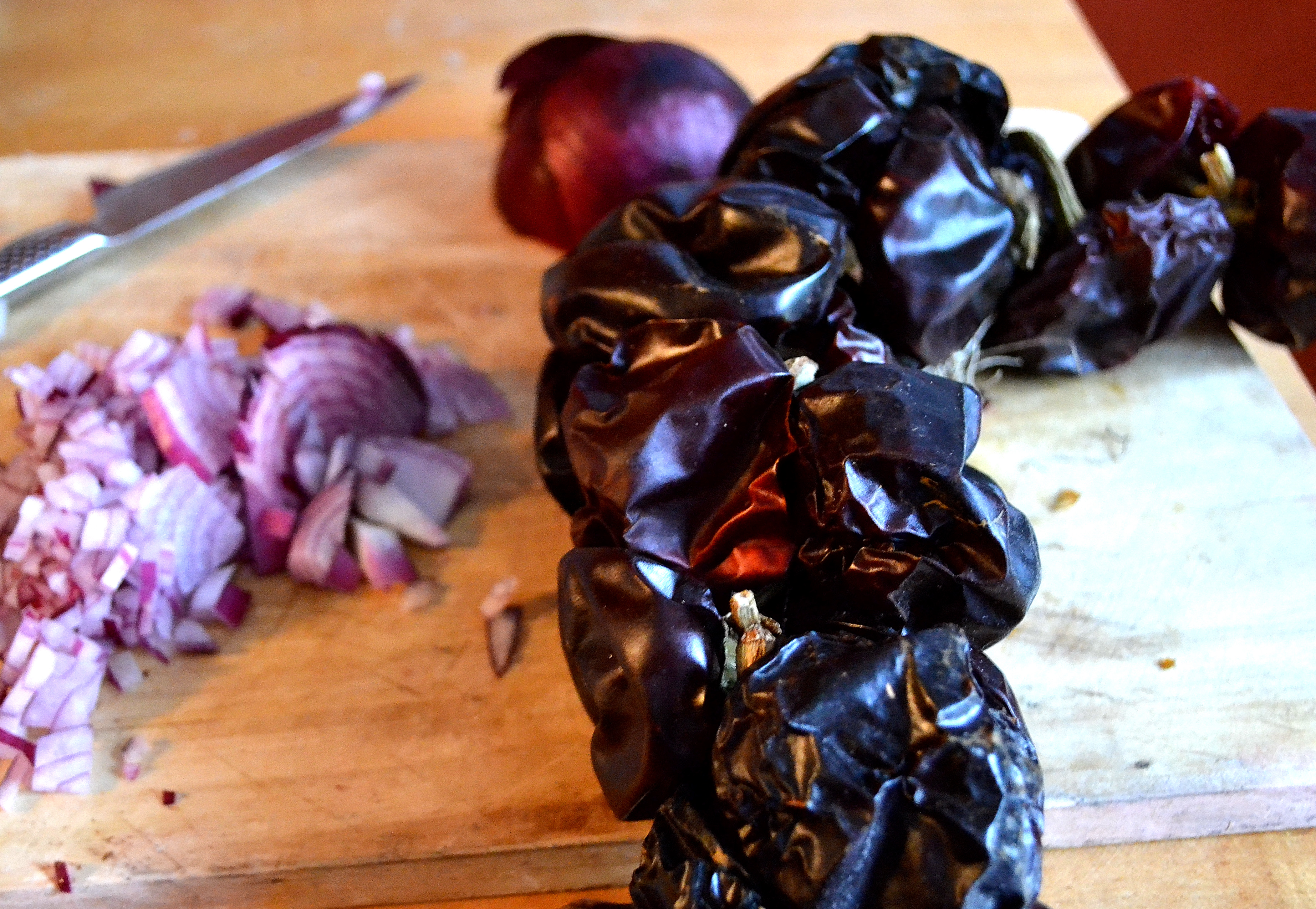 I made this chutney to go with a cheese course in an elaborate themed multi-course meal. It does contain two somewhat hard-to-find ingredients: huckleberries, a fruit native to the Western United States, much beloved by bears, and somewhat similar in appearance and flavour to blueberries, but wilder, more fragrant, and fruitier. (Unlike blueberries, as far as I know, huckleberries cannot be cultivated.) If you cannot find huckleberries, a mixture of blueberries and finely chopped fresh apricots would be a reasonable substitute. The second unusual ingredient is dried ñora peppers, a mild, earthy Spanish pepper that is the key ingredient in traditional Romesco sauces, usually sold dried and strung together like Mexican chilli peppers. You can get ñora peppers at specialty Spanish food stores or online; in Britain and Europe, you can order them from http://www.souschef.co.uk. (Disclaimer: Sous Chef is my lovely friend Nicola’s company.) The dried ñora pepper provides depth and a certain inexpressible something to the chutney, but I suspect that if you omit it, the chutney will still be delicious.