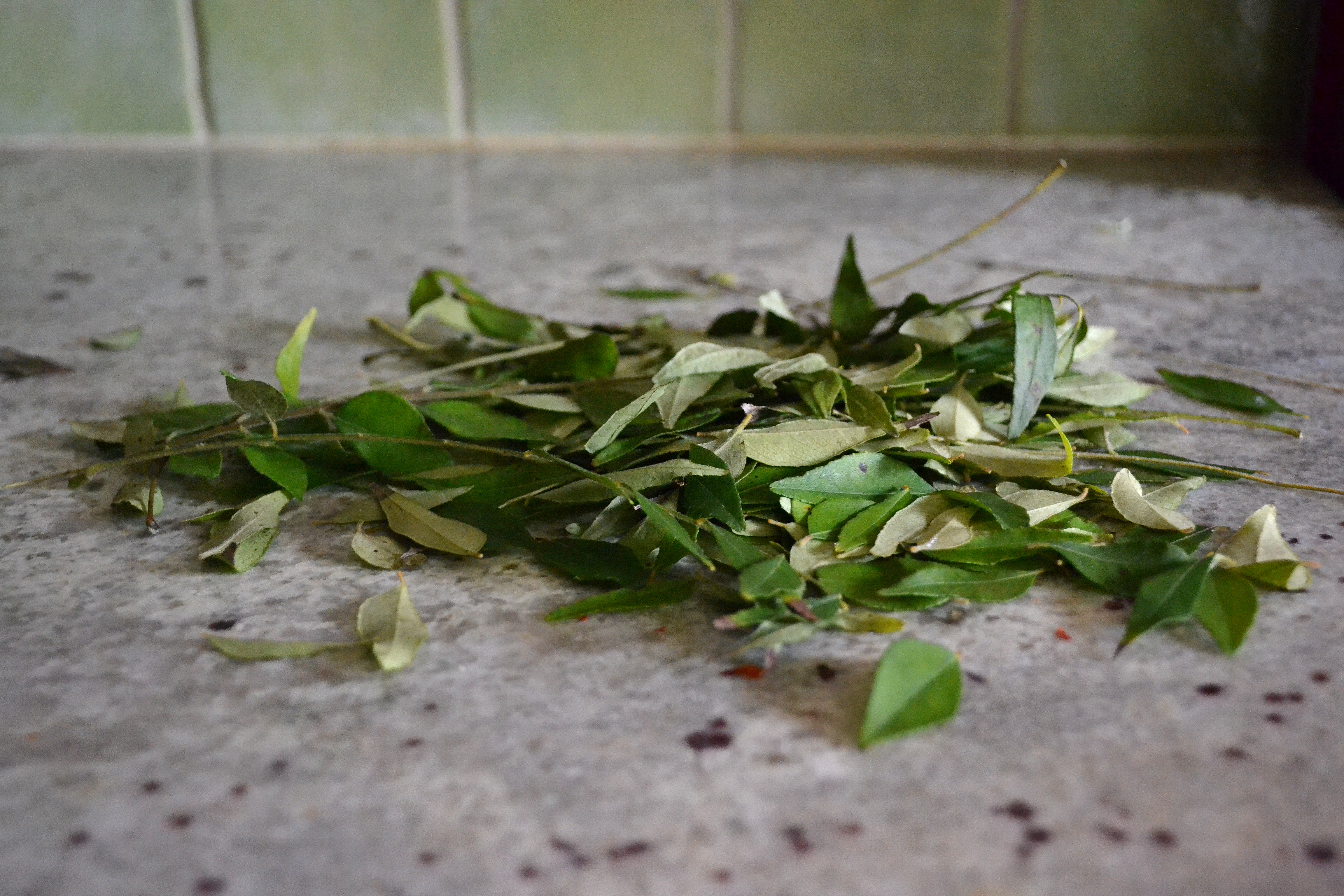 I made this last night for monday night dinner and it was fantastic ! I have recently moved to a new apartment near Gare du Nord, in the Indian and Sri Lankan neighborhood, I had no problem finding the leaves in a local shop, although the man kept them behind the cash register and not with the other produce, which attests to their preciousness. I now have a rather large bag of them and need to find more recipes and/or a way to store them ! The local takeaway shops use them in very spicy donut shape potato based snacks, and there are some chickpeas ones also…