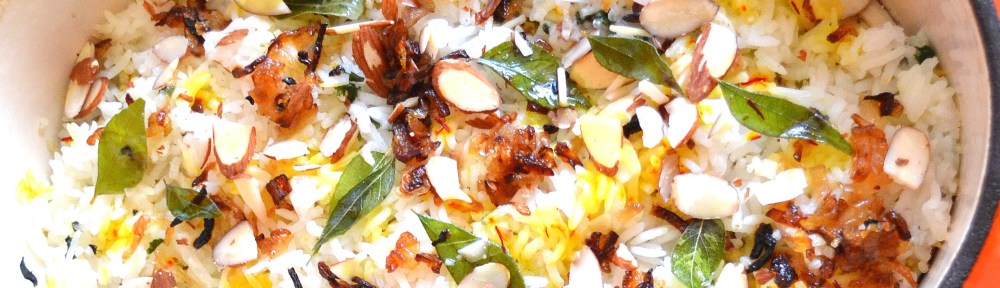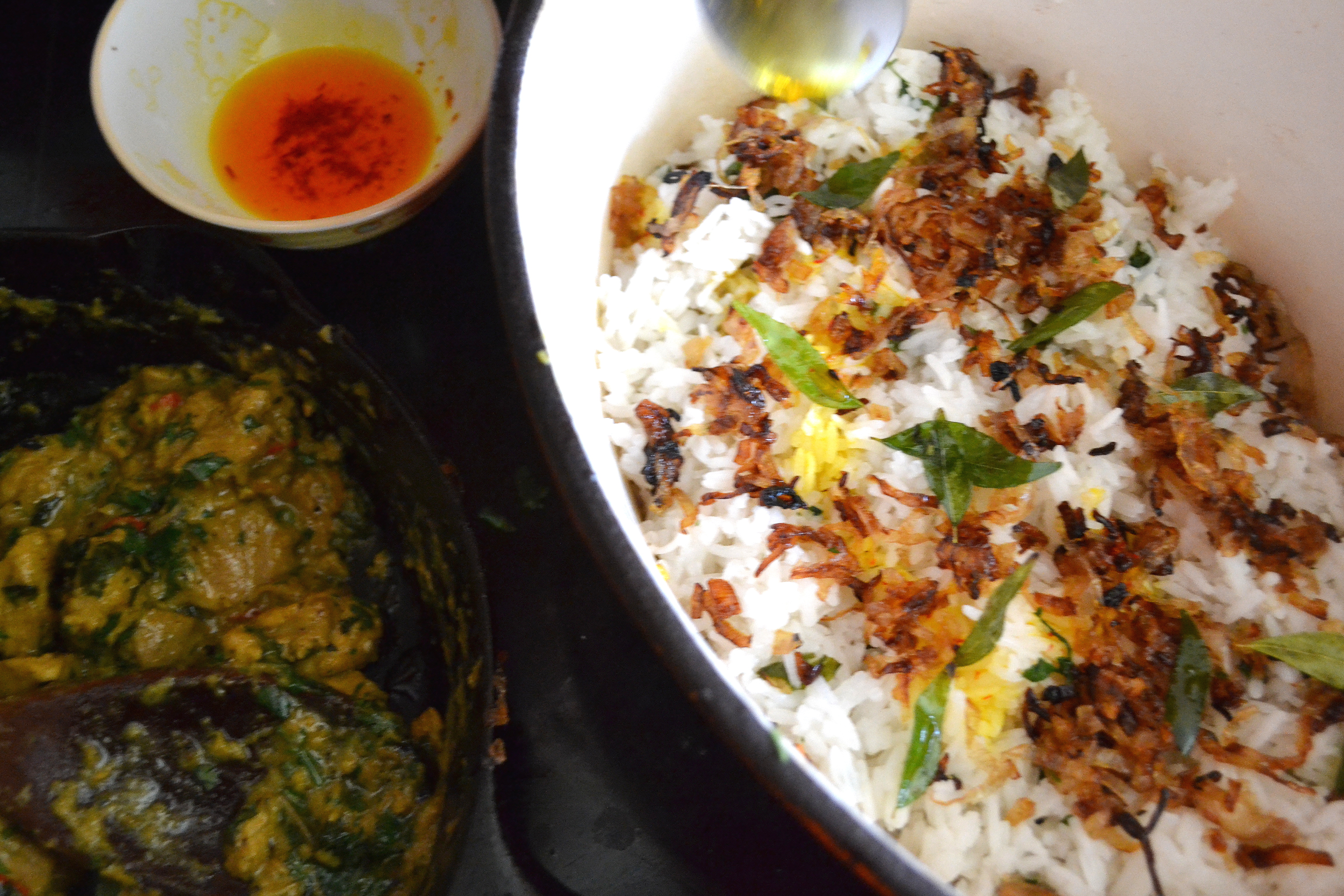 028aBiryani, the storied Indian dish of fragrant layered rice, spices, and (usually) meat, if made well, is one of my favorite things. A good biryani is richly aromatic; indeed, a magnificently flowery aroma is an essential part of the dish. Biryanis are made throughout India, and preparation differs depending on the region. Some biryanis are made with coconut, some with ghee, yogurt, or buttermilk; spices may include cardamom, coriander, cinnamon, fennel, or mace, among many others. The intoxicating aroma usually comes from saffron, sometimes with a touch of rosewater or kewra (pandan syrup). The word biryani is said to be of Persian origin, a corruption of the word beriyan, which in Farsi means to fry before cooking, or birinj, which means rice. Biryanis are thought to have been brought to India by the Mughals in the 16th century, although some culinary historians believe the dish pre-dated the empire. Regardless of origin, the dish has proliferated—in Hyderabad alone, there are said to be over forty distinct versions.
