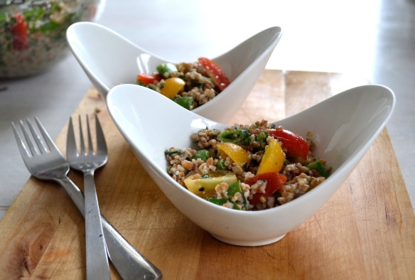 In London we have had one of the coldest, wettest springs on record. This morning when I went to the Marylebone Farmer’s Market people were heroically sitting in the nearby park wearing wool hats and scarves. I was wearing a winter jacket, and I was still chilly. Nevertheless, my circadian clock tells me summer is coming, or at least I think that’s why I have stopped craving big dark wintry stews and instead hanker after light fresh-tasting salads. This bulghur salad is a request from my sister. (I LOVE getting requests for recipes.) She apparently has a lot of bulghur in her pantry, and as it happens so do I: last week I crankily picked up a sack of coarse bulghur for 70 p from one of the innumerable Middle Eastern groceries that dot northwest London so I could meet the £5 minimum to use my credit card. But how fortuitous! I love this salad. Continue reading