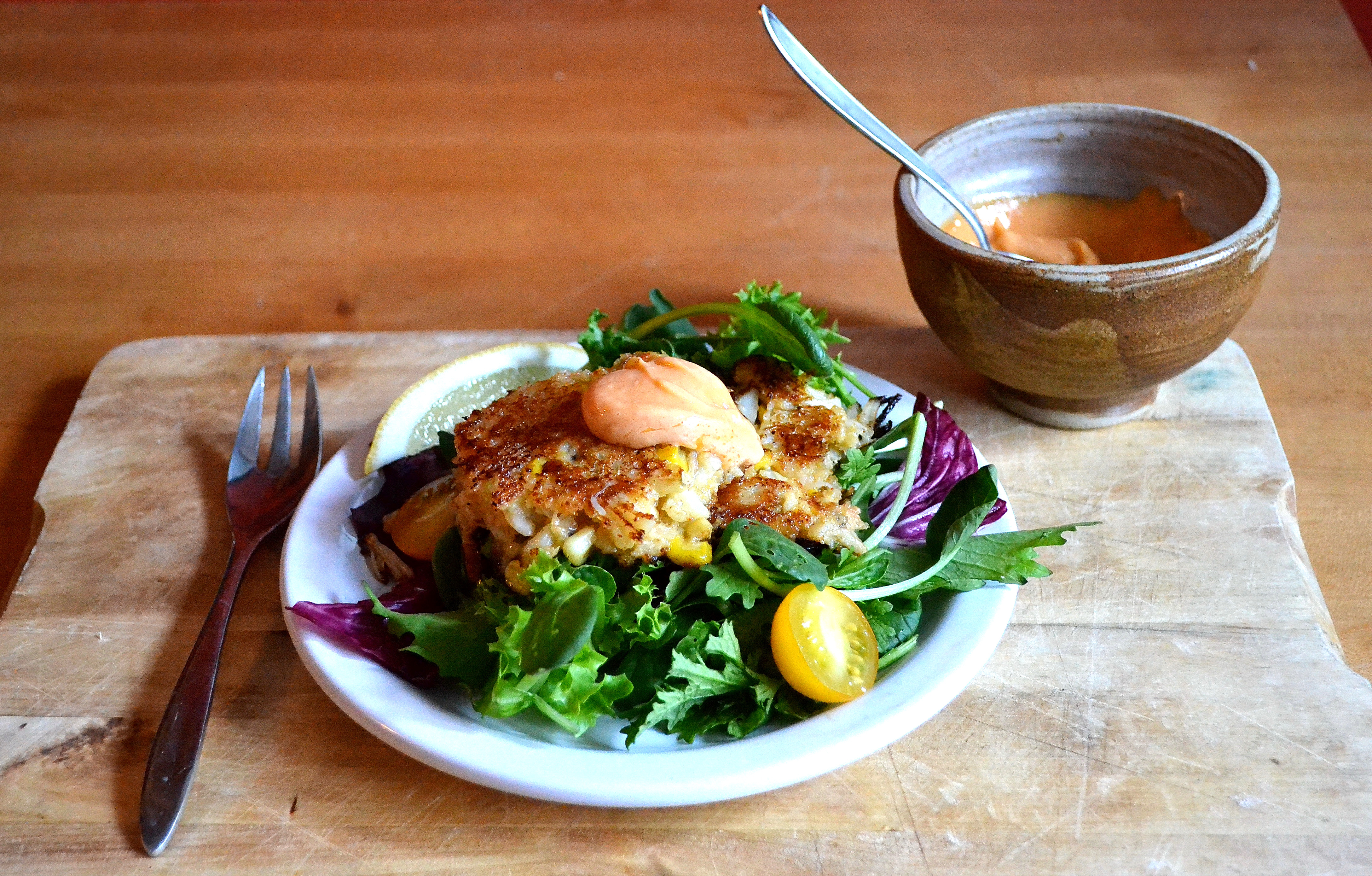 Dungeness Crab and Corn Cakes with Sriracha Mayonnaise
