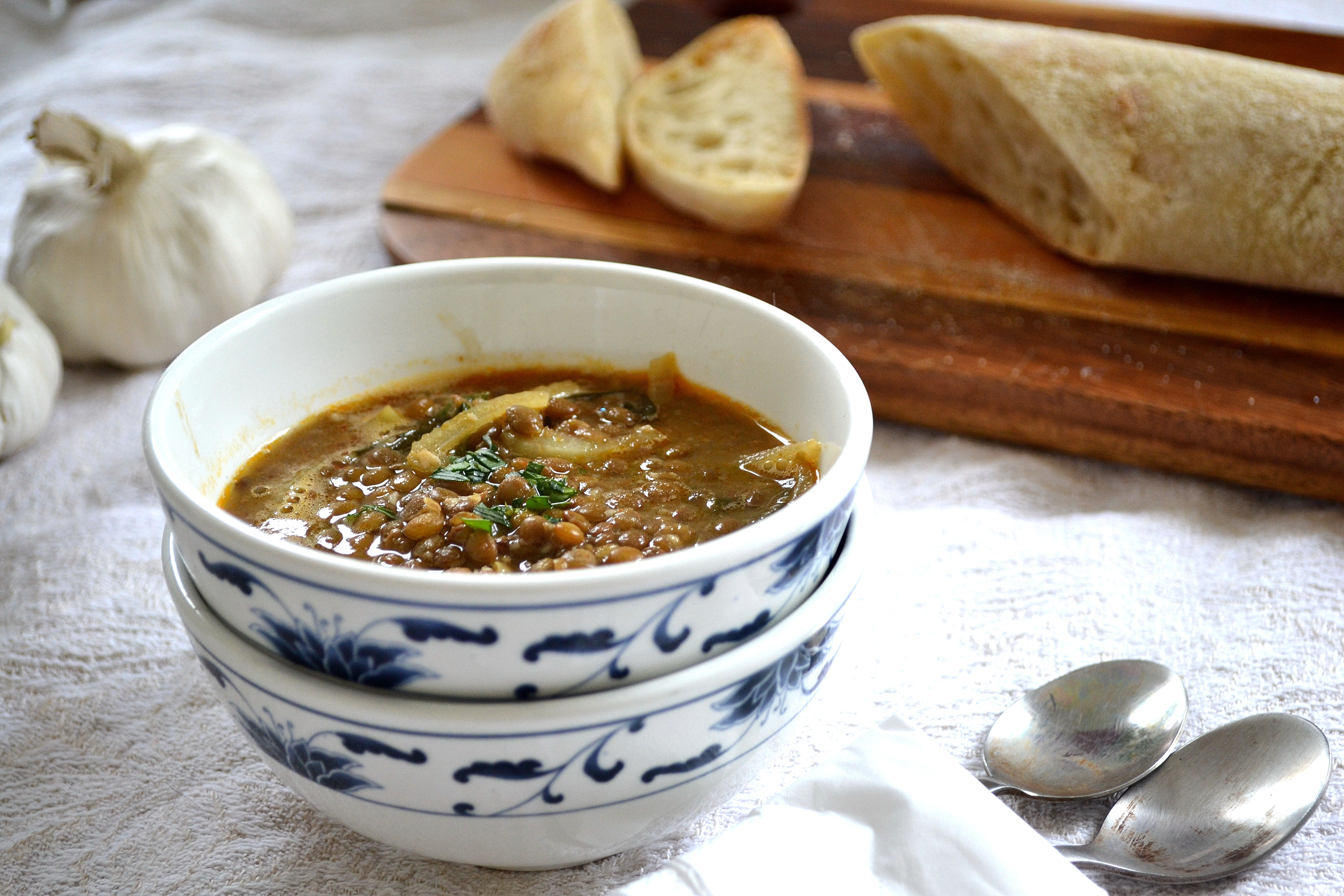 Garlic and Puy Lentil Soup with Smoked Paprika and Spicy Greens